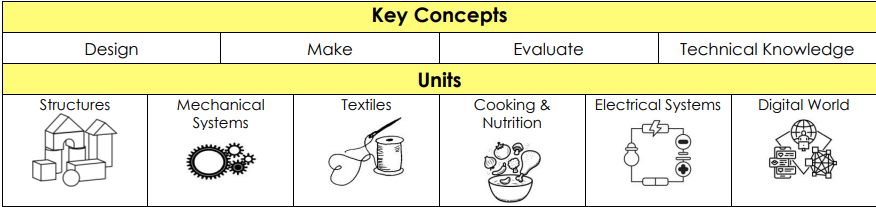 There are then 4 strands that run through each topic: - Design - Make - Evaluate - Technical Knowledge