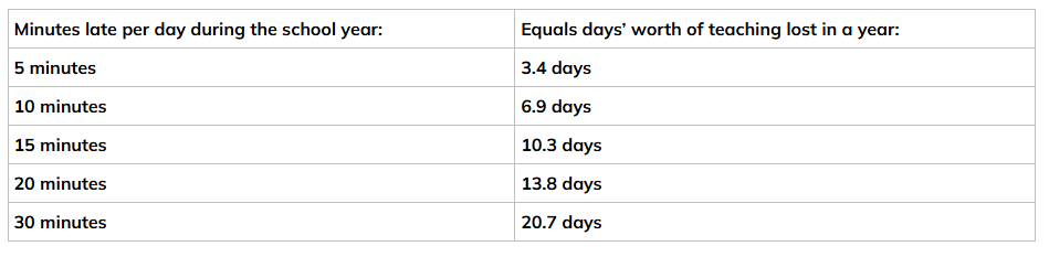 The chart below explains how many days of school your child will miss if they do not attend school on time each day: